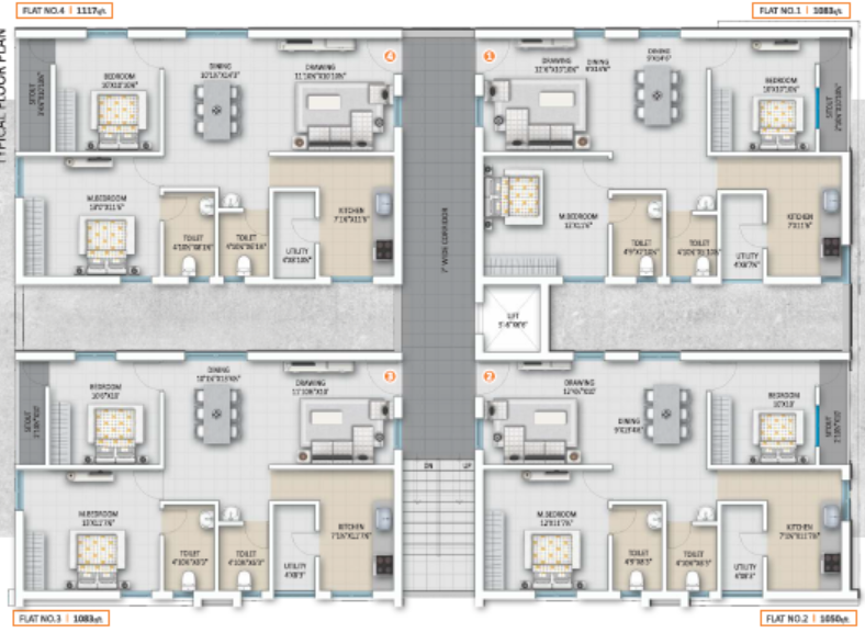 4 flats per each floor. Total 5 floors
