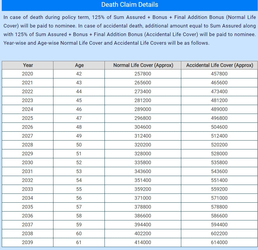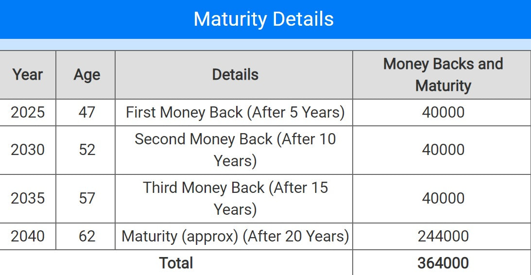 Year Age Details Money Backs and Maturity
